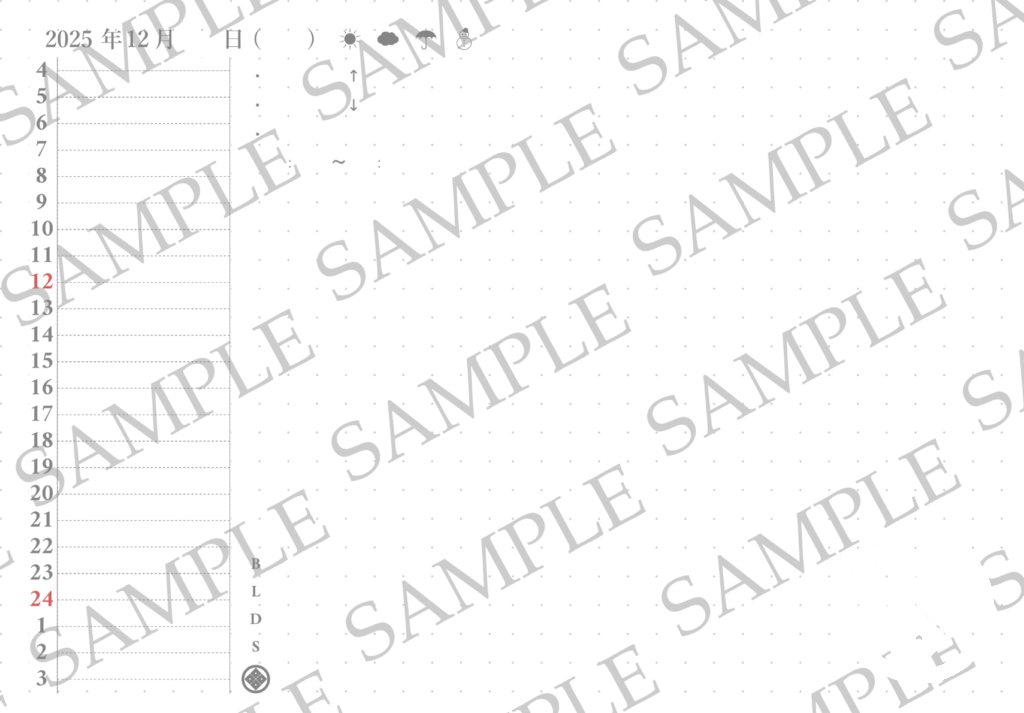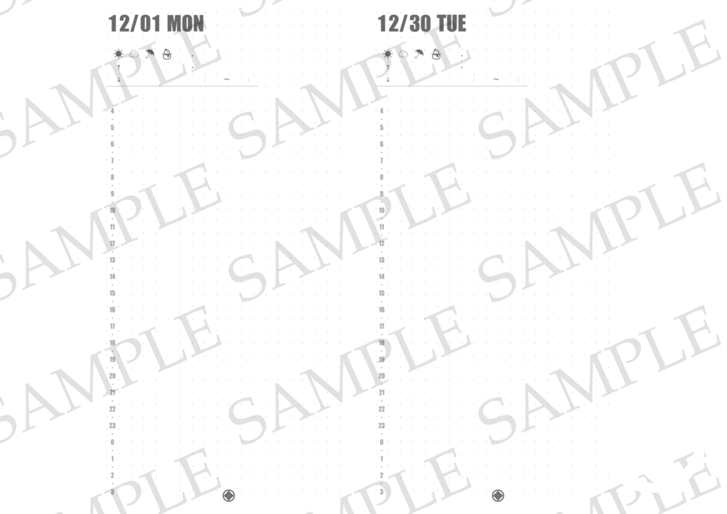 上の画像のマンスリーページとデイリーページはA4印刷時の見え方ですので、折ったり切ったりして使います。