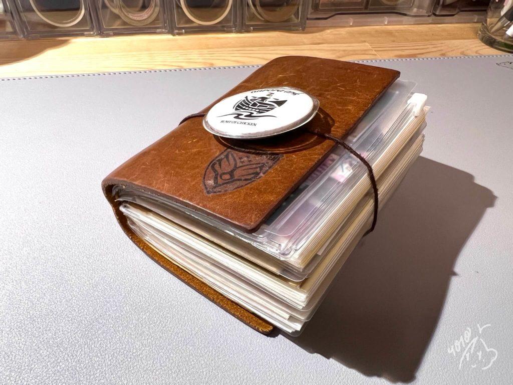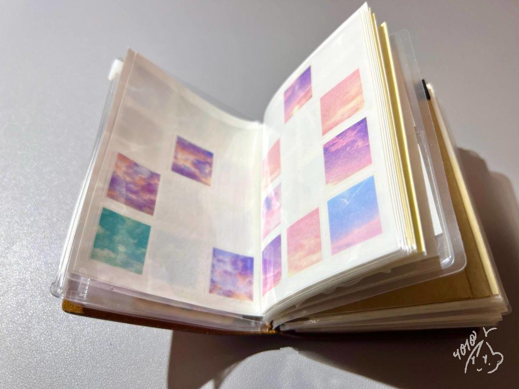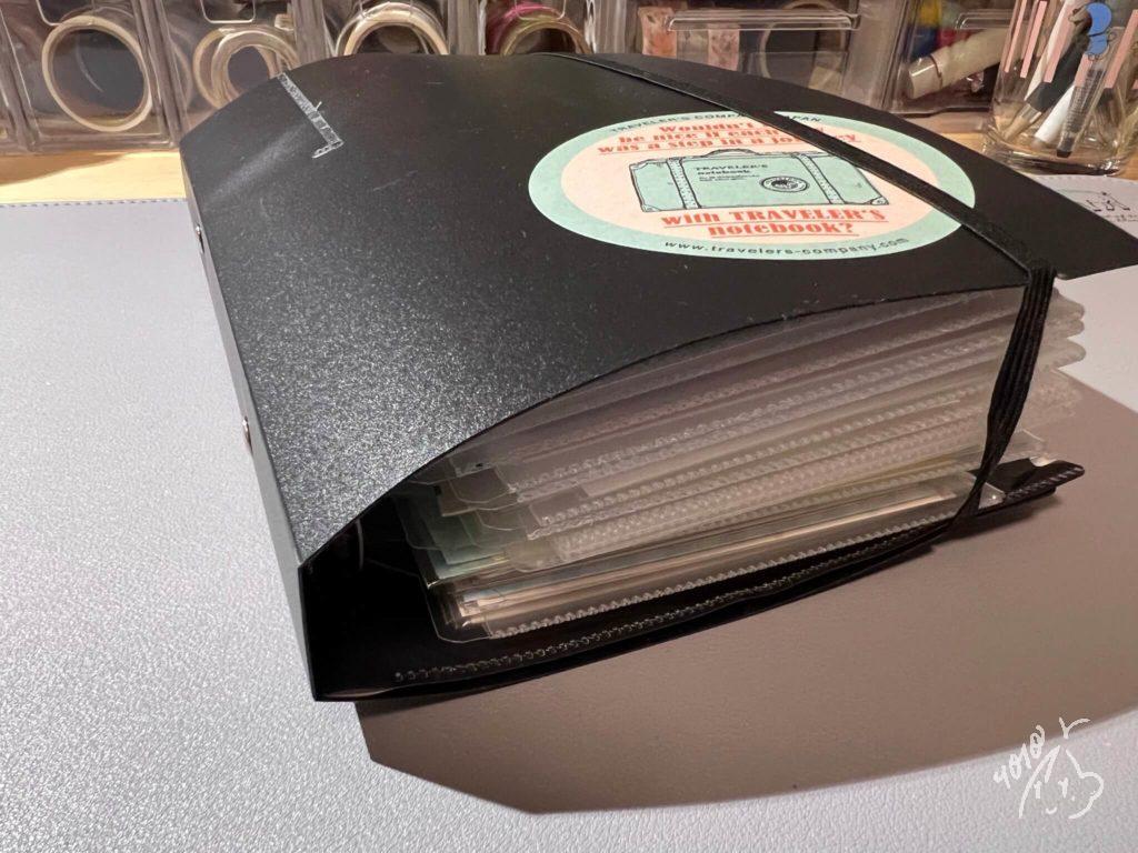 DAISOの6穴リングバインダーにプラスチックのポケットリフィルを使用して挟んでいます。
